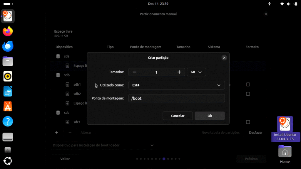 No caso do Ubuntu, nós só precisamos utilizar o ext4 como padrão para o /boot e nesse exemplo deixamos 1GB para o /boot.