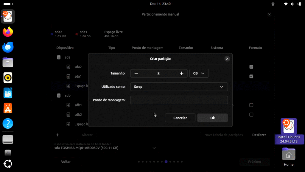 • Flags/Rótulos: Marque como boot e esp se o instalador pedir.