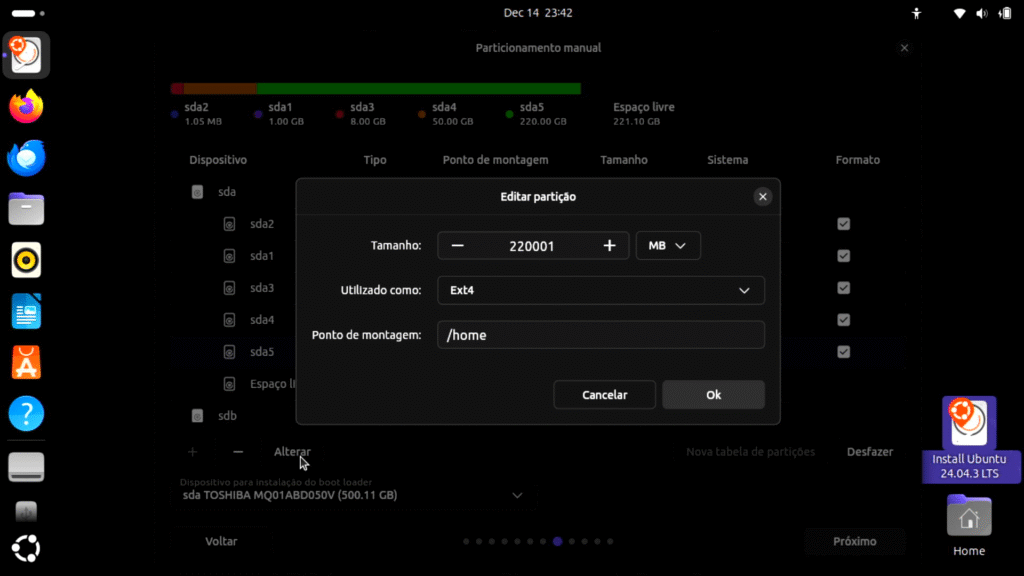 Essa é a “pulo do gato” do particionamento manual. Criando essa partição separada, se você decidir trocar de Linux no futuro ou precisar formatar o sistema, seus documentos, downloads e músicas estarão salvos aqui.