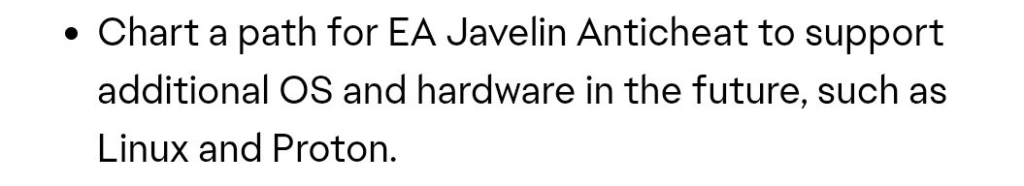 “Trace um caminho para que o EA Javelin Anticheat ofereça suporte a sistemas operacionais e hardware adicionais no futuro, como Linux e Proton.”
