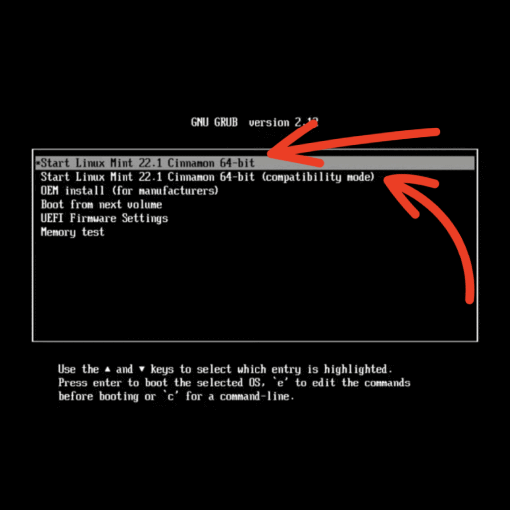 Iniciando o Linux Mint, vamos na primeira opção (start Linux mint) se não aparecer opção de download tente (start Linux mint in compatibility mode).