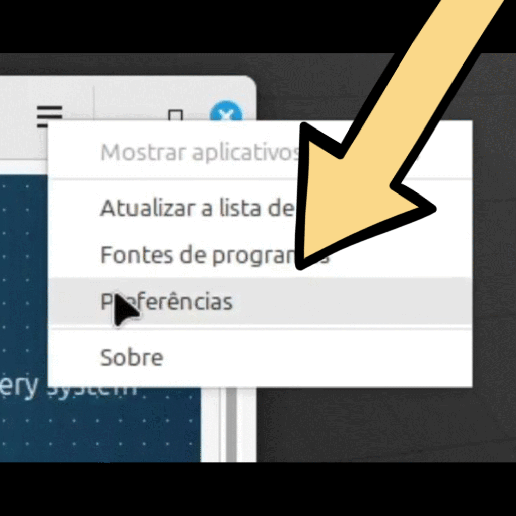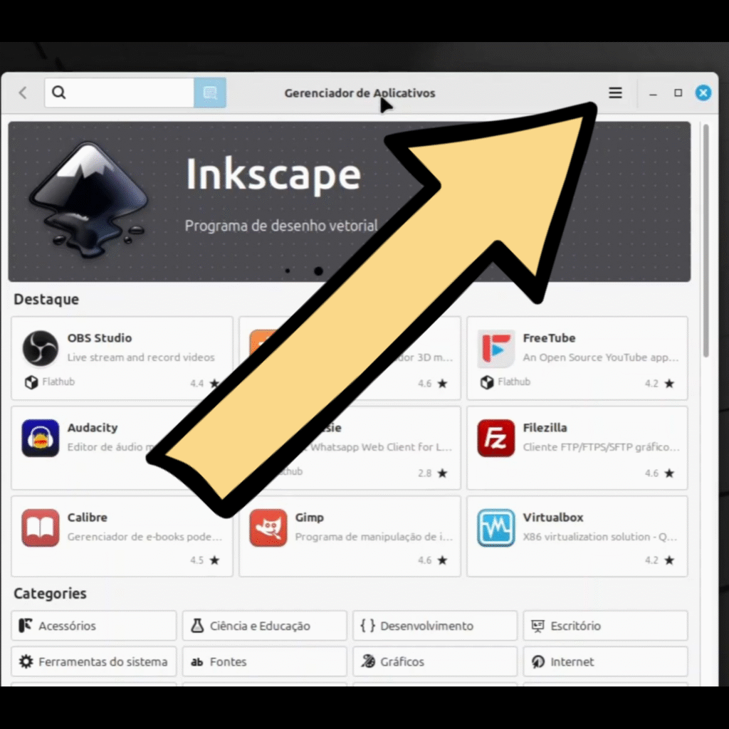 Depois de finalizar a tela de boas vindas e seguir o passo a passo, vamos abrir o gerenciador de aplicativos que no linux mint seria a loja de aplicativos, então vamos nas três linhas da direita de cima.