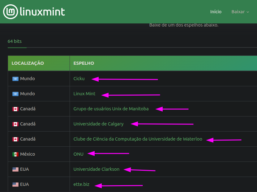 Uma vez que já escolheu a DE do seu sistema, clique em Download na opção escolhida e vai carregar uma página, e descendo a página vai aparecer Mirror/Espelho que seria o download da iso do sistema. Agora a parte de localização é onde está hospedado o download. Por recomendação, baixe nos países mais próximo do Brasil ou nas duas primeiras opções que são globais.