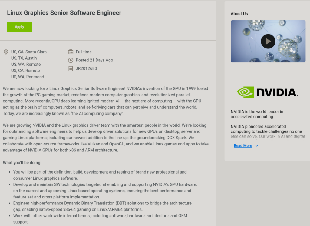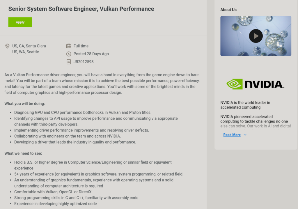 Além de a vaga não ser específica para o desenvolvimento apenas em Vulkan, a Nvidia detalha a necessidade de colaboração com o OpenGL e a possibilidade de tradução visando alto desempenho de jogos x86-64 para ARM64/Linux.